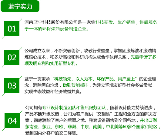 河南藍寧科技股份有限公司位于全國歷史文化古城——商丘。地處豫、魯、蘇、皖四省交界(連 霍高速入口處),交通十分便捷,有著得天獨厚的地理優勢。我公司是政府招商引資項目、是專業 生產廢橡膠、廢塑料、廢機油煉油設備的公司,采用廢橡膠、廢塑料、廢油為原料生產出燃料油的 工藝,已榮獲環保認證和專利多項。